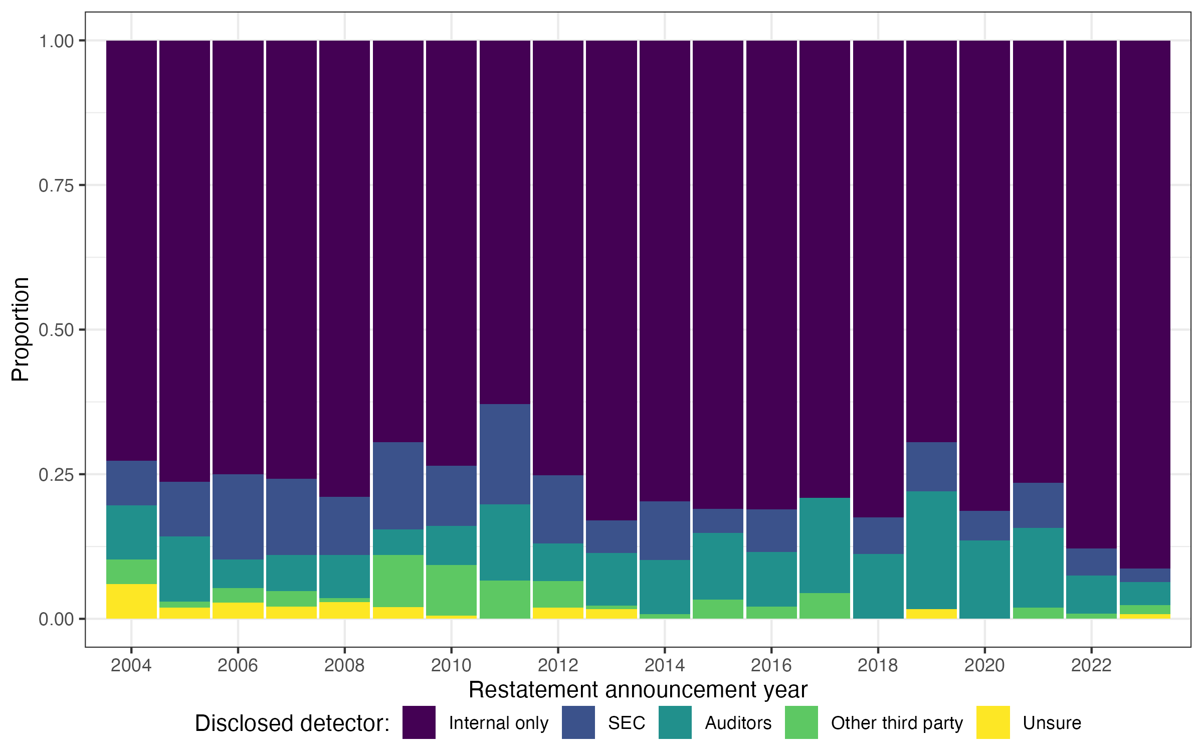 Big R restatements are significant corporate events, yet there is limited evidence on the roles of management, auditors, the SEC, and other third parties in detecting material misstatements. Similarly, little is known about how firms disclose these detectors. Using large language models and restatement announcements, we identify who firms credit for detecting material misstatements and contrast these disclosures with evidence from SEC comment letters and investigations. We document a large gap between disclosed and observed SEC detection. Consistent with a stylized model of the trade-offs between valuation and reputation consequences of this disclosure choice, firms that credit the SEC experience more negative market reactions but reduced executive turnover. We further show that managers are less forthcoming about SEC’s involvement when the SEC’s actions are less visible, and when their compensation is more sensitive to stock price.